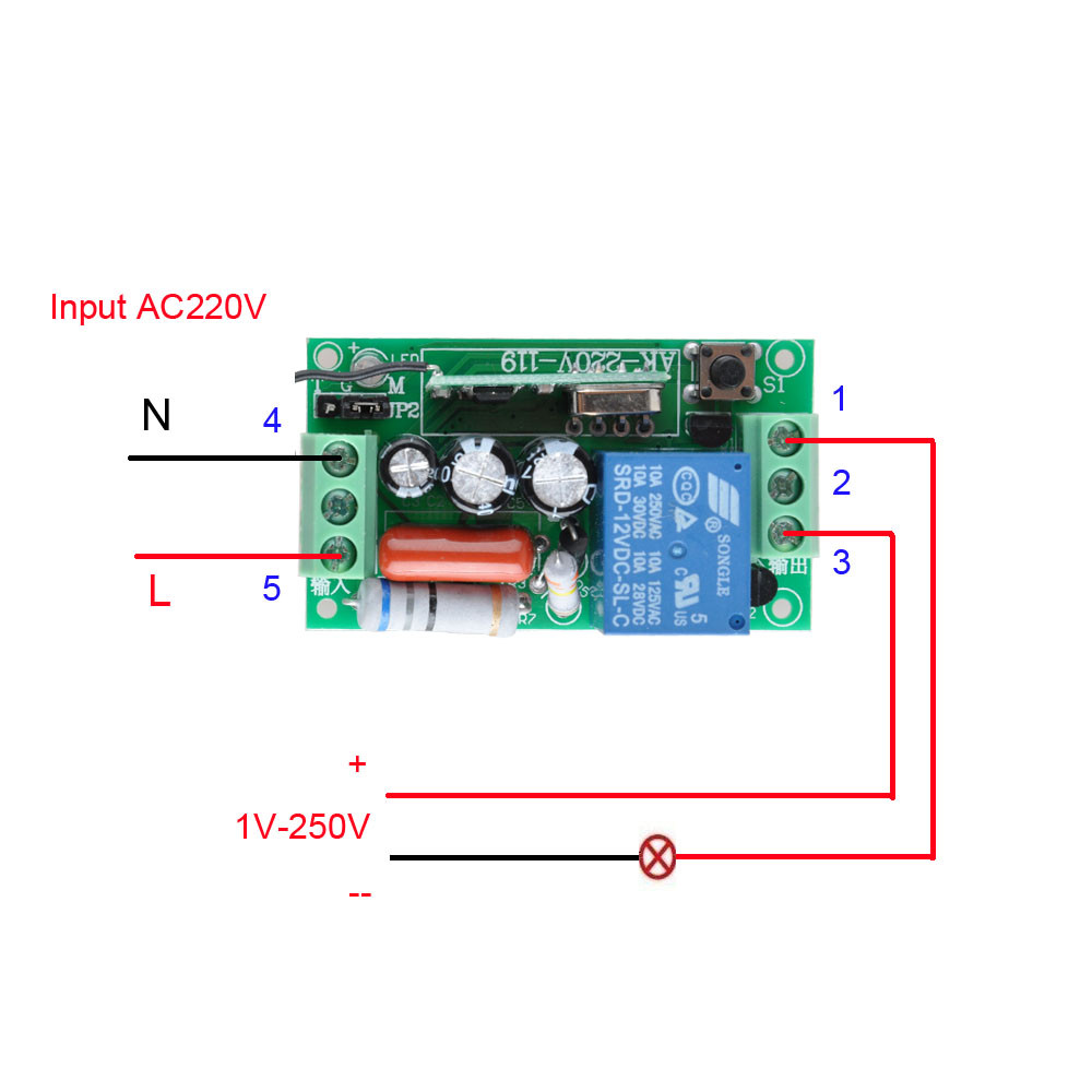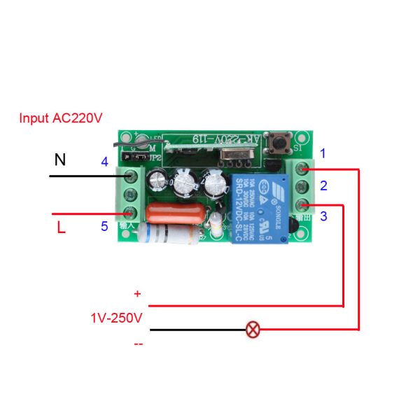 While the receiver is designed for 220V AC, you can use it to switch a 12V DC circuit by using an external 12V power supply. Connect the AC power to the receiver as normal, and connect the 12V load to the “LOAD” and “N” terminals (ensuring the DC load is within the relay’s 10A rating).