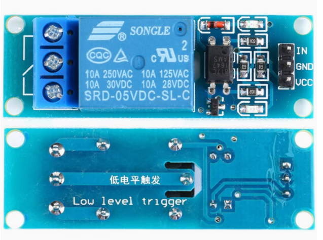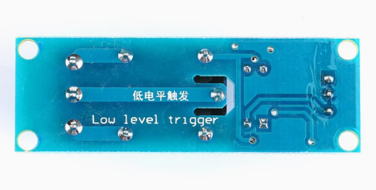 Low-level trigger means the relay activates when the IN pin is pulled LOW (0V). High-level trigger means the relay activates when the IN pin is HIGH (5V). This module is low-level trigger, which is safer because the relay remains off during power-up or if the control signal is lost