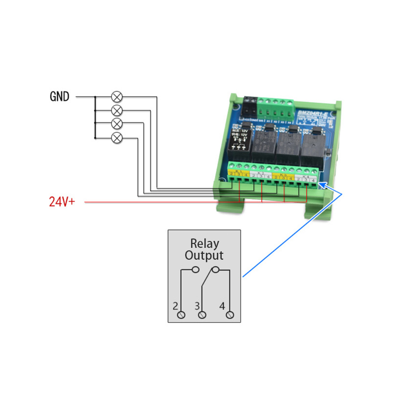 No. The input circuit is designed for 3.3V–5V only. Applying 24V to IN1–IN4 will damage the optocoupler inputs. If you need a 24V control version, please see our BMZ-04R1-E 24V input version (separate product).