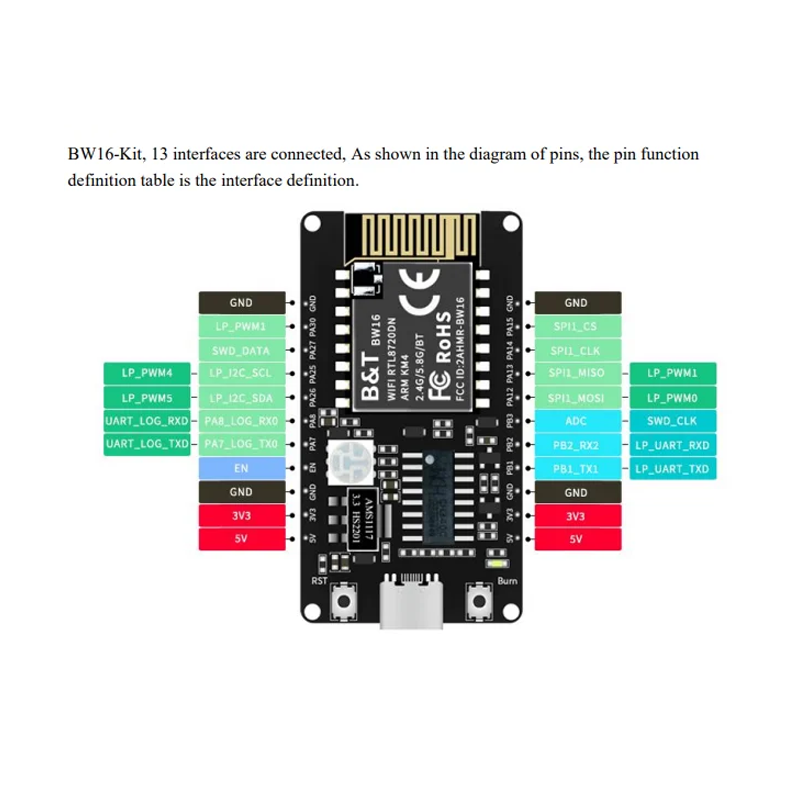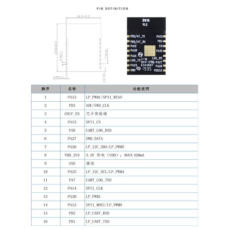 The BW16 module features a compact SMD package with the following key pin assignments (varies by variant, refer to your specific board’s documentation) :