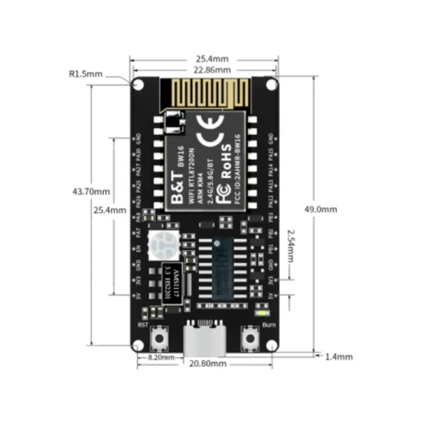 The BW16 is a high-performance, low-power dual-band wireless communication module developed by Ai-Thinker based on the advanced Realtek RTL8720DN chipset. This compact SoC (System on Chip) module combines 2.4GHz and 5GHz dual-band Wi-Fi (802.11 a/b/g/n) with Bluetooth 5.0 (BLE) support in a single integrated package, making it ideal for next-generation IoT devices, smart home applications, and industrial automation .