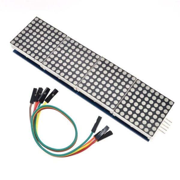 The module consists of four individual 8×8 LED matrix panels arranged in a line, each driven by its own MAX7219 chip. The modules are pre-wired in a cascade configuration, with data flowing from one module to the next .