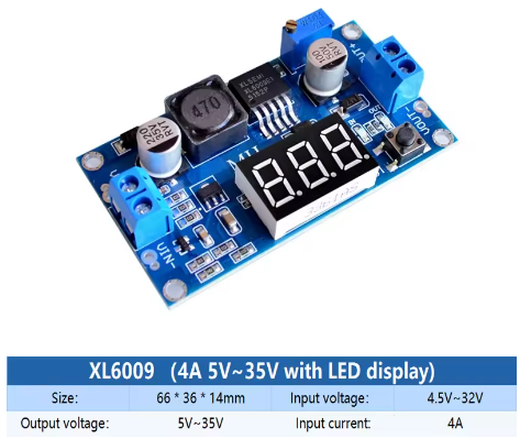The XL6009 module features an integrated LED digital voltmeter that can monitor either the input voltage (from your power source) or the output voltage (supplied to your load) . This feature eliminates the need for a separate multimeter when setting up or monitoring your system.